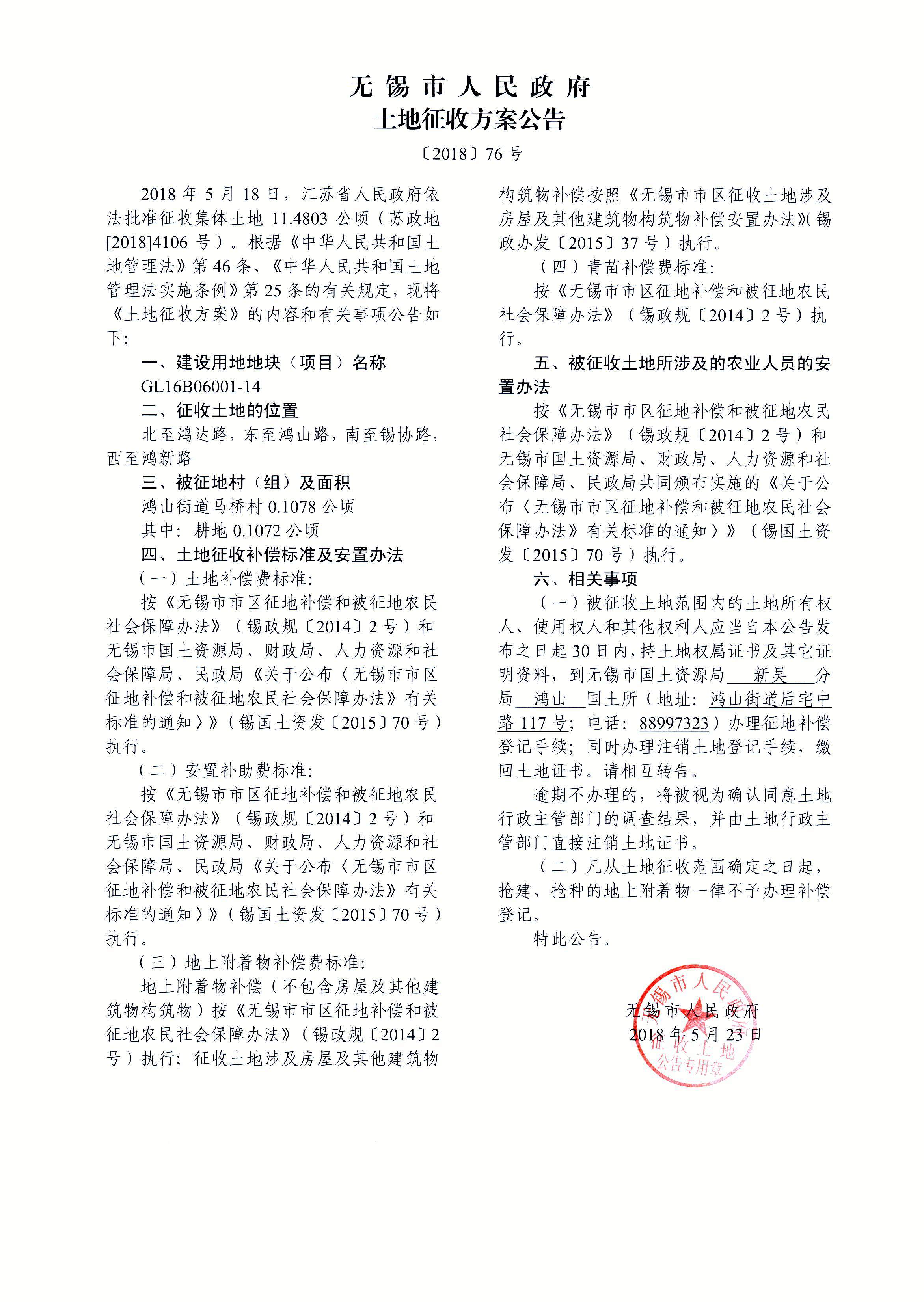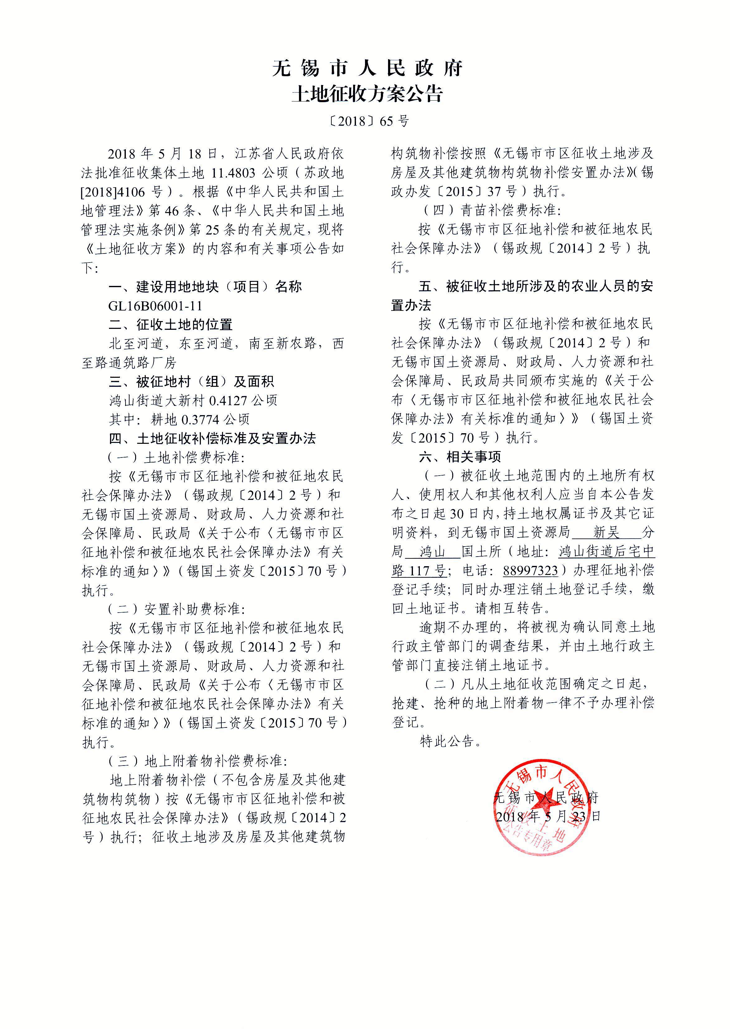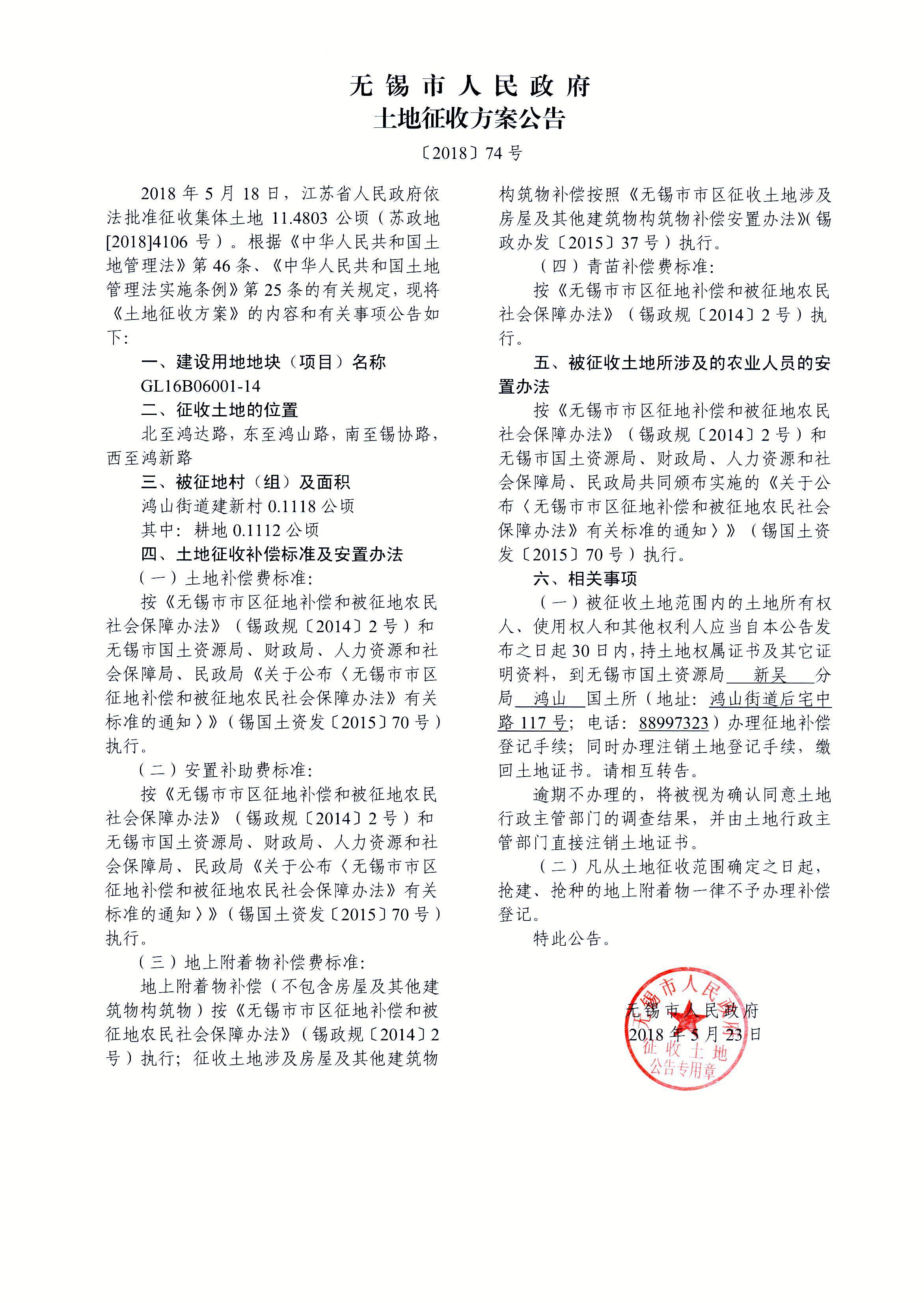 无锡市新吴区城乡建设用地增减挂钩建新区2018年第1批次(16挂)建设用地 土地征收方案公告