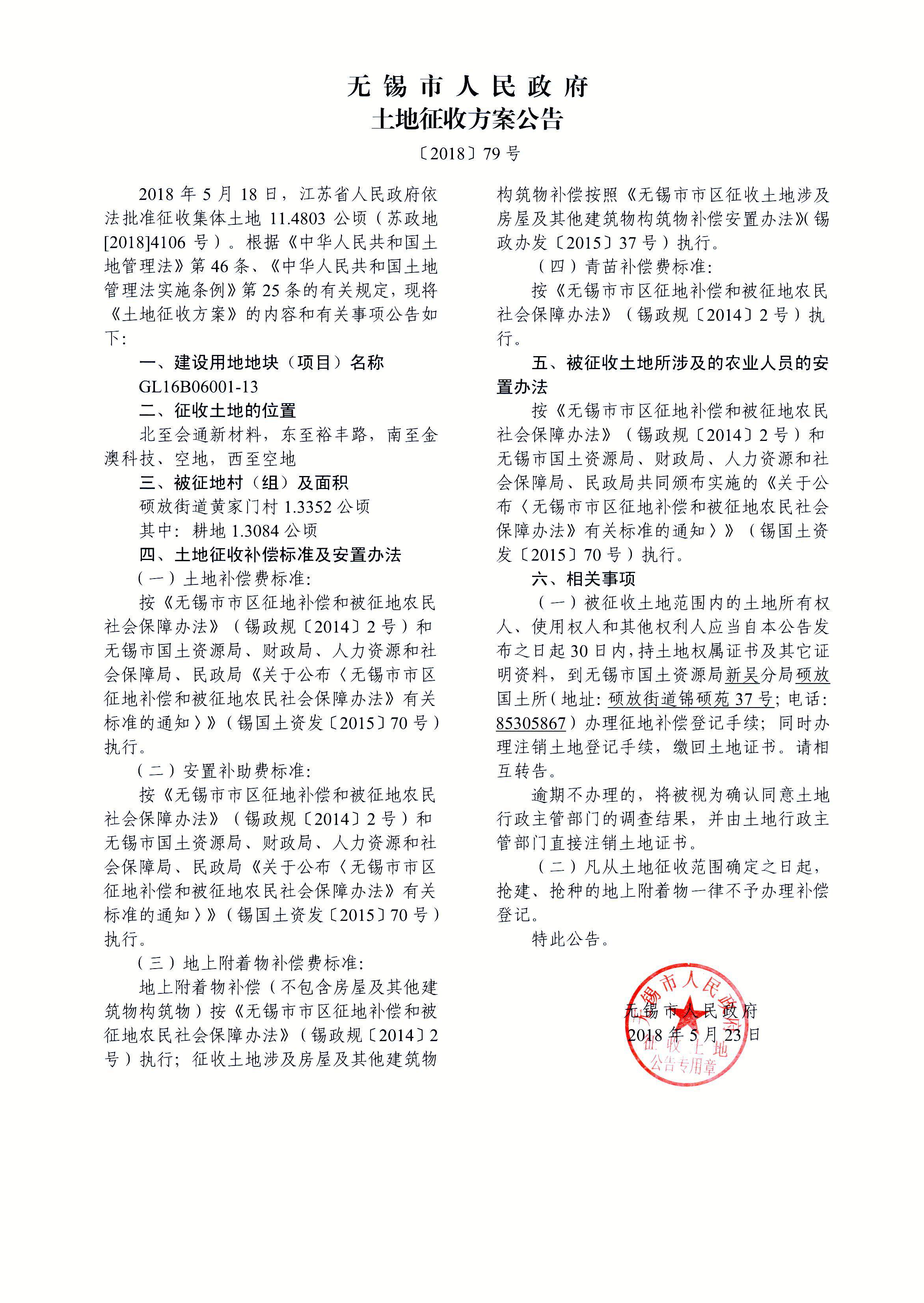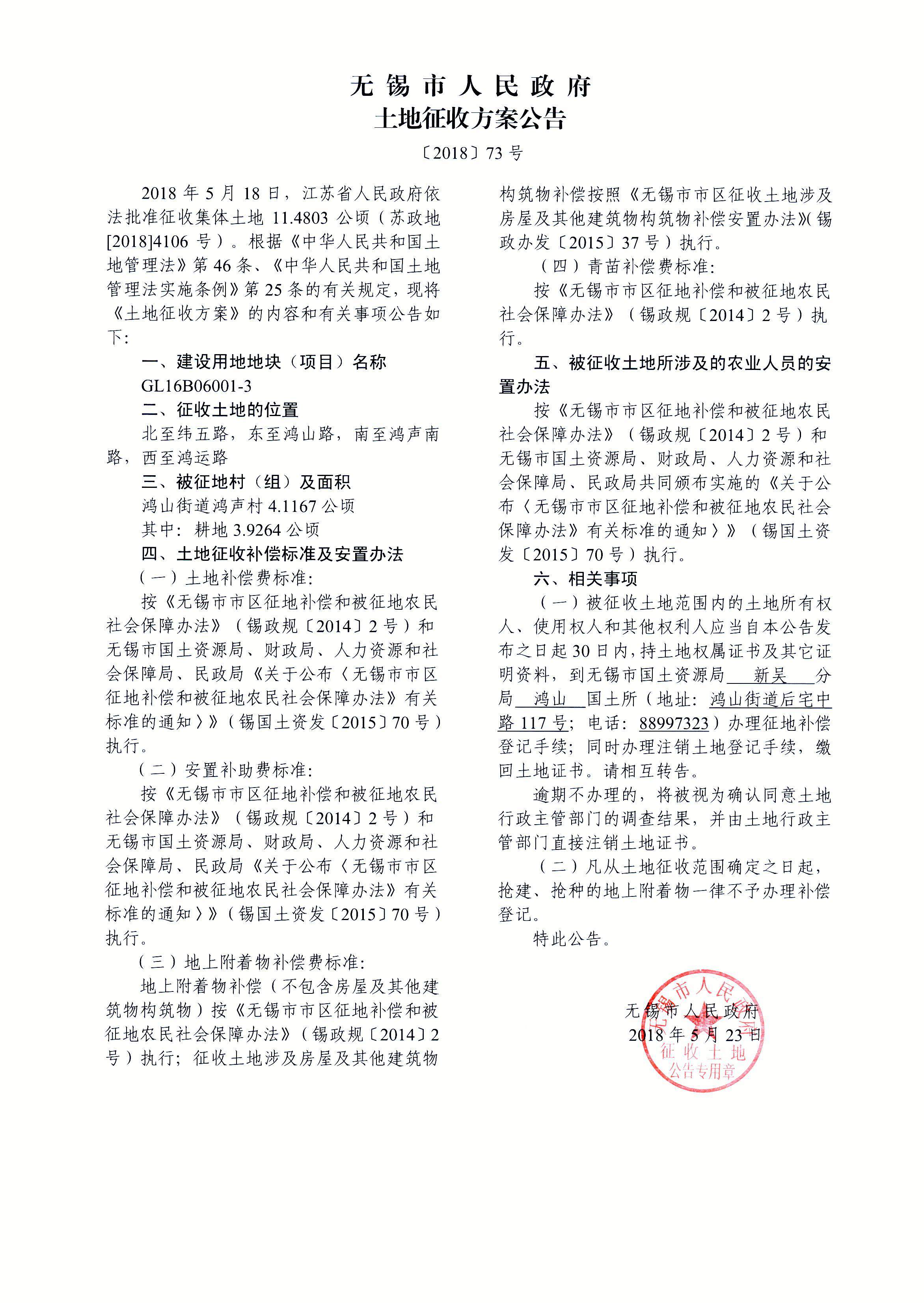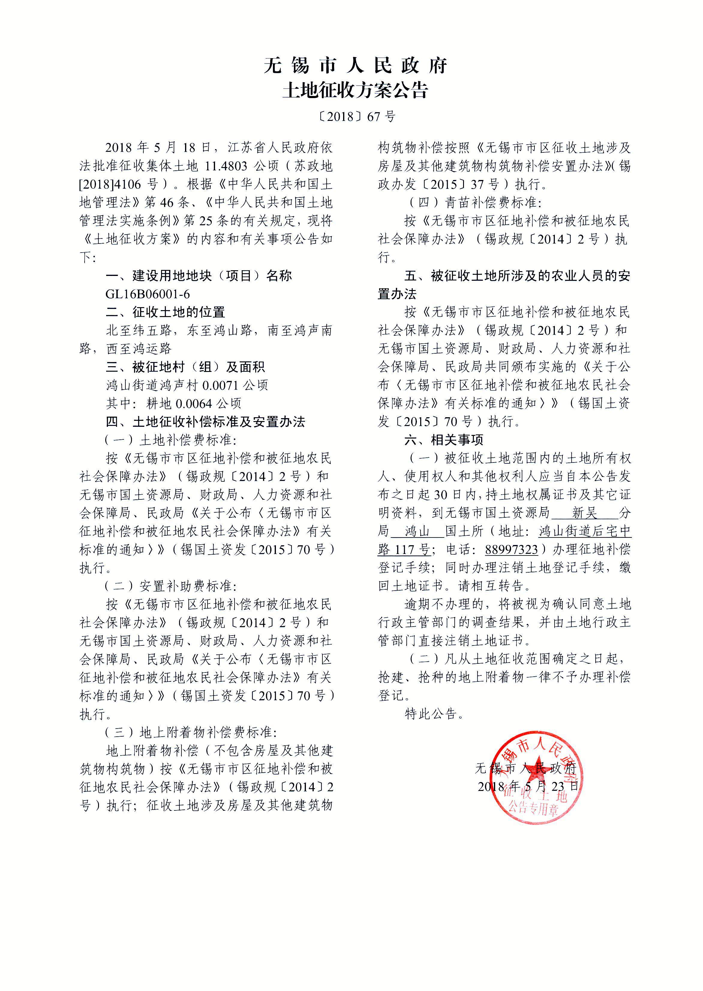 无锡市新吴区城乡建设用地增减挂钩建新区2018年第1批次(16挂)建设用地 土地征收方案公告